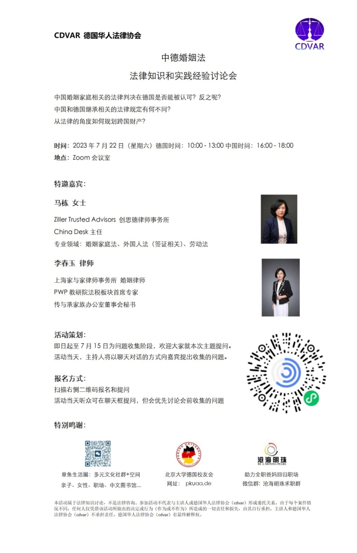 - 德国华人法律协会CDVAR于2023年7月22日举办中德婚姻法-法律知识和实践经验讨论会。北大德国校友会协办。特邀嘉宾:马栋女士和李春玉律师。