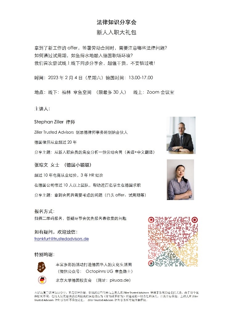- 2023年2月4号,北京大学德国校友会协办的法律知识分享会之"新人入职大礼包"在柏林章鱼空间同时线上线下成功举行。本次活动旨在为新入职员工提供有关劳动合同和职业发展的重要知识。主讲人: Stephan Ziller 律师,德国小聪聪(张琼文)。